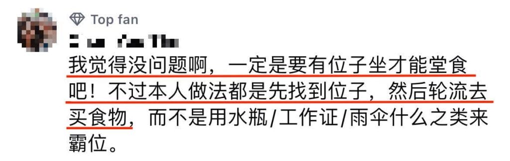 「午餐时间人很多,一边排队、一边用东西占位子,其实不是好办法,反而让现场更乱。」