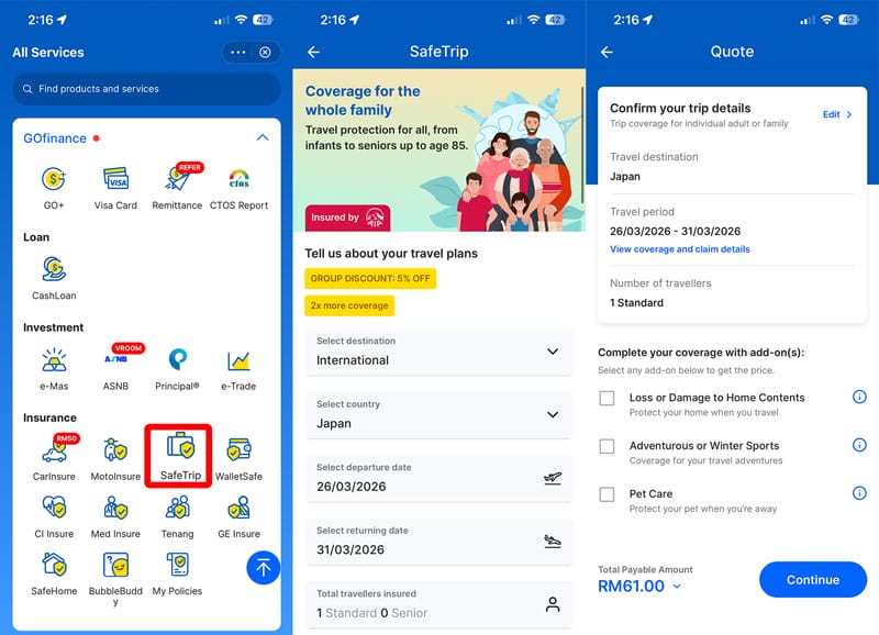旅游保险直接在 TNG eWallet 内购买, 多一层保障,人在国外真的安心很多。