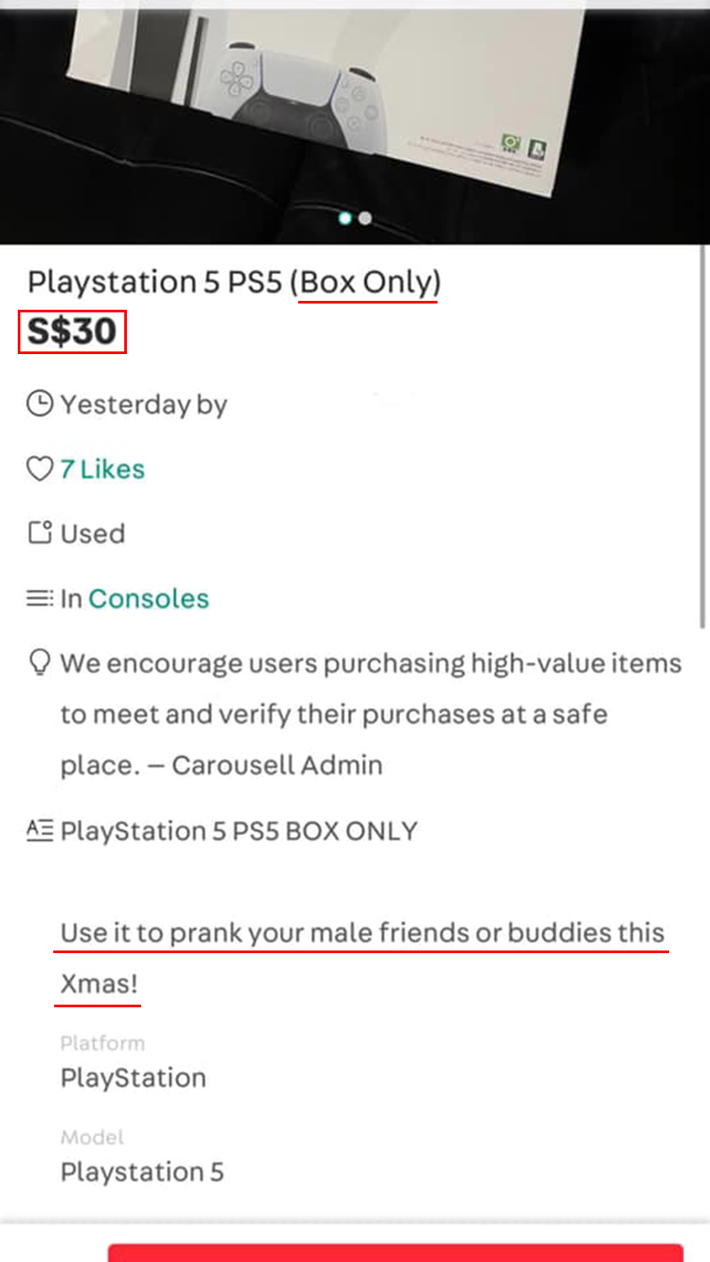▼因为新推出的 PS5 非常受欢迎,全球都在缺货,也有许多人还买不到。于是 Leslie 把这个盒子放到 Carousell 上以新币 30 元(约 RM90)的价格售卖,并强调「可以用来在圣诞节 Prank 你的男生朋友」!