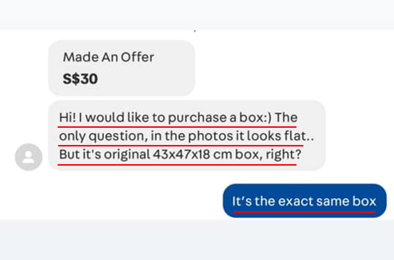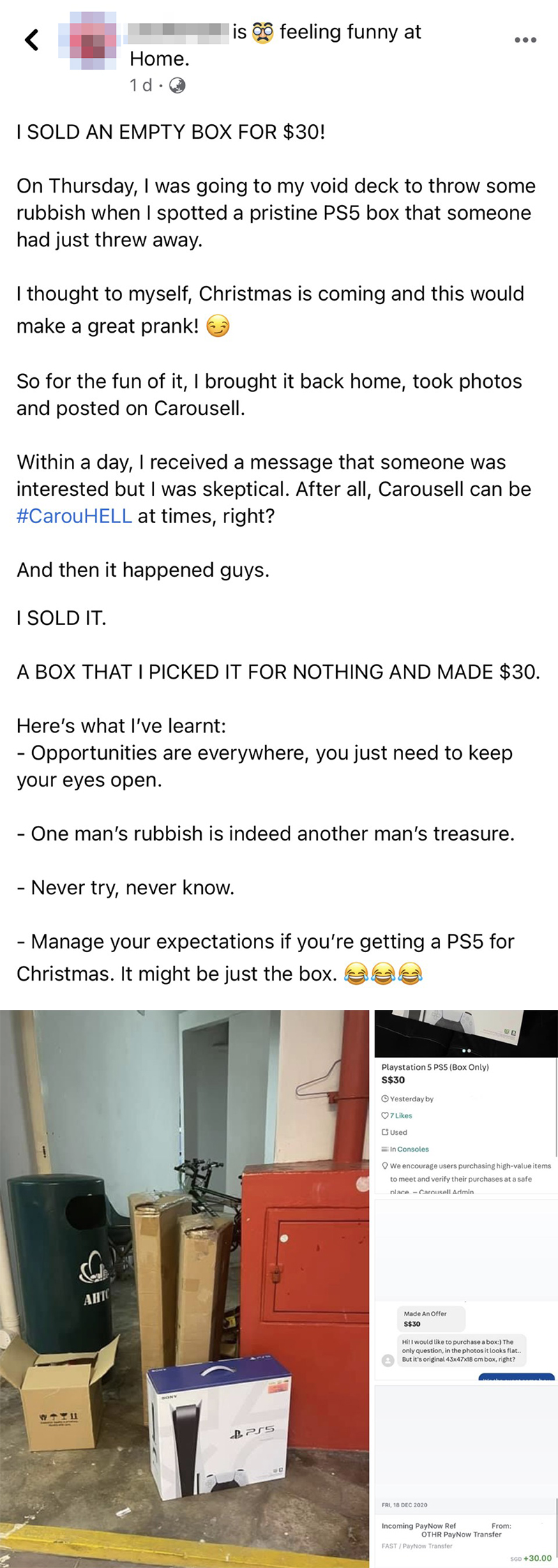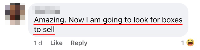 ▼最后这名买家真的用新币 30 元(约 RM90)把空盒子买走了!这次的经验让 Leslie 直呼:商机无处不在,你只需要睁大眼睛!一个人的垃圾很可能是另一个人的宝藏!不尝试的话永远不知道结果!