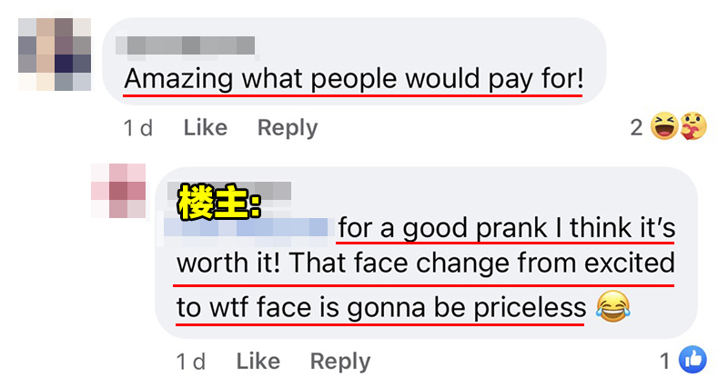 楼主:为了 Prank 其他人,我觉得很值得!看对方的表情从期待变成傻眼,这个过程是无价的!