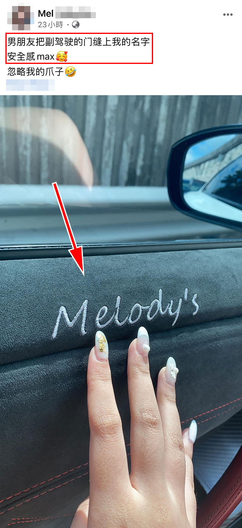 ▼昨日一名大马男友直接在副驾驶的车门上,缝上女友的名字,以此证明「这里是我女友的专属宝座」!让女友看的心花怒放,so sweet~真的安全感满满啊!