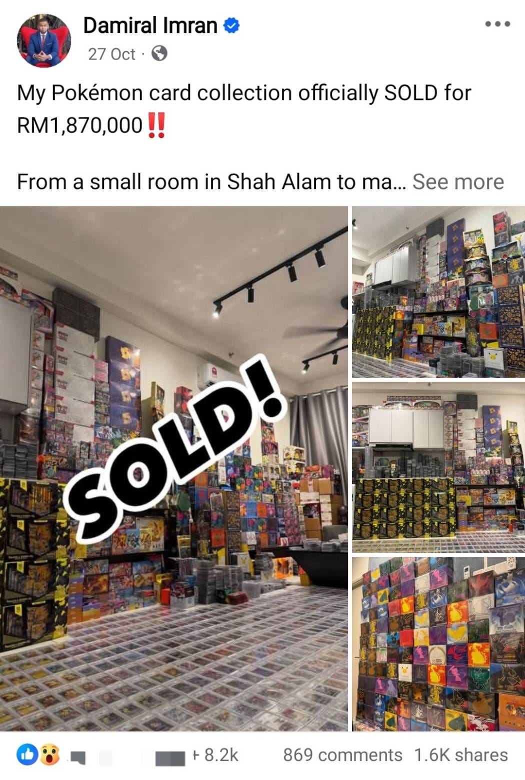 Damiral Imran 长年热衷于收集宝可梦卡牌,珍藏品无数。据悉,他手中的卡牌有经过美国专业机构(Professional Sports Authenticator)鉴定,估值超过 RM100 万。