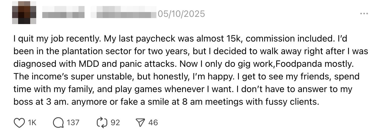 本地一名男子最近在 Threads 上分享自己的转行经历。他为了身心健康,毅然辞去了 RM15,000 (包括佣金)的高薪工作,转行当送餐员。