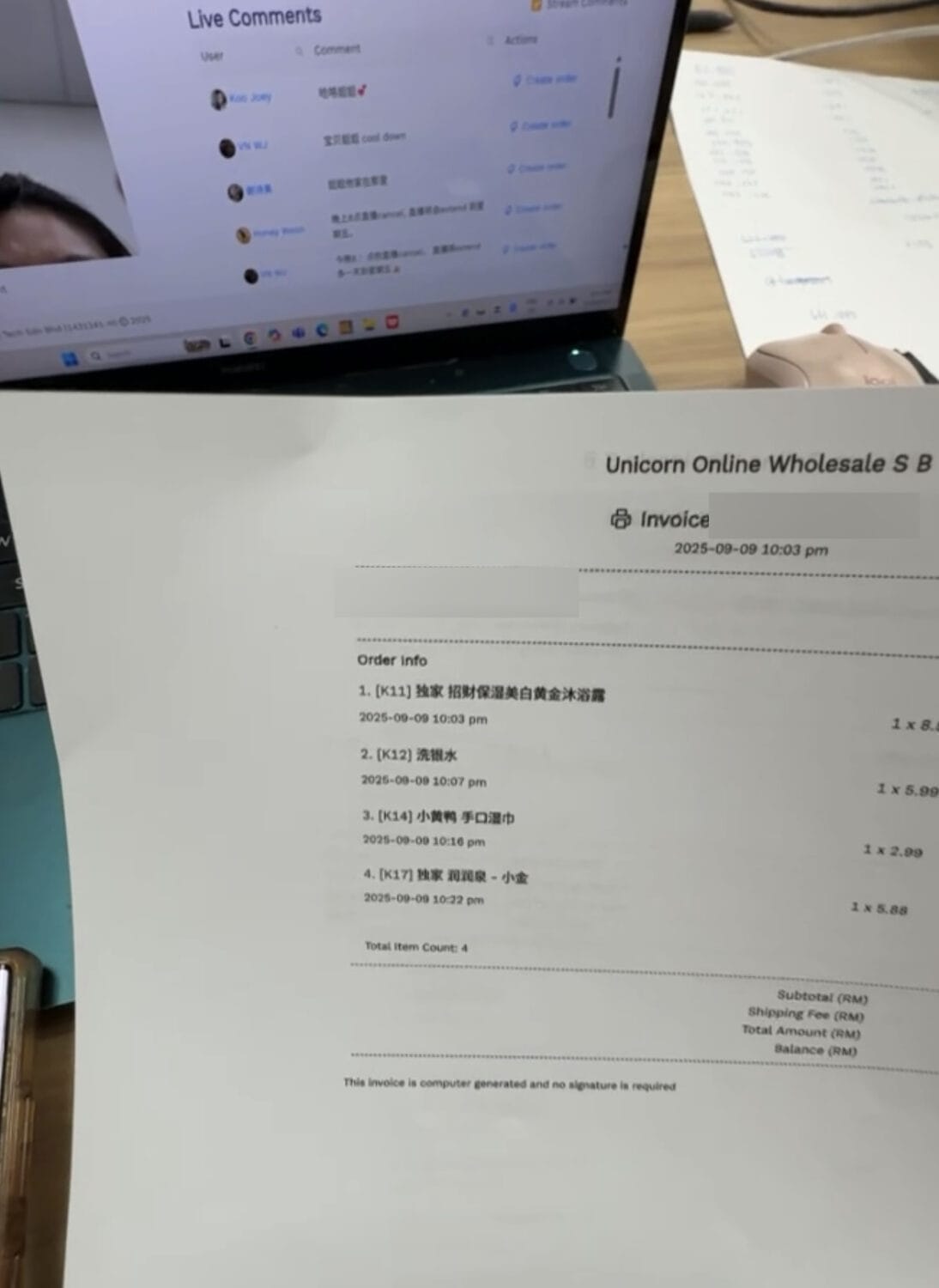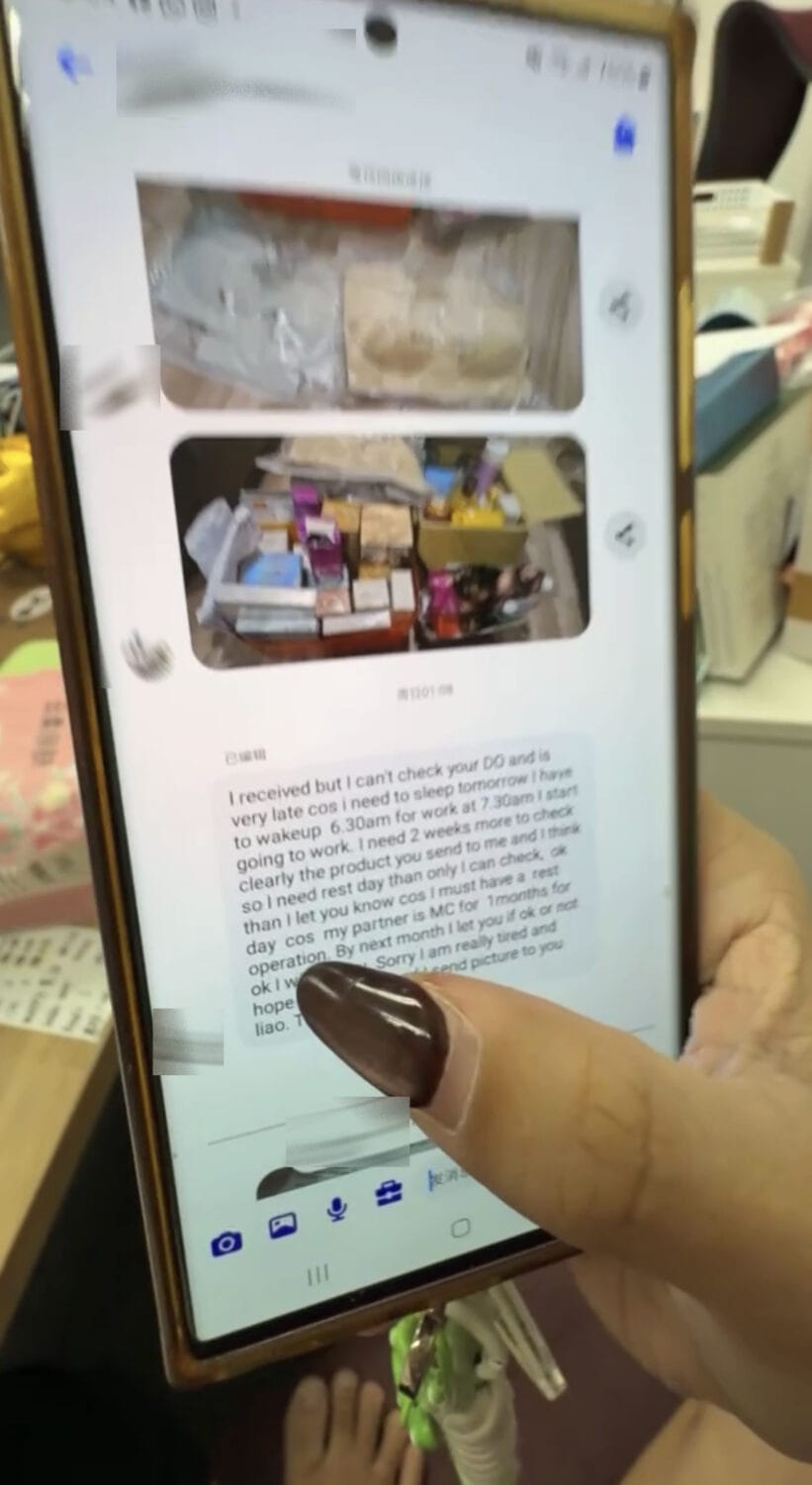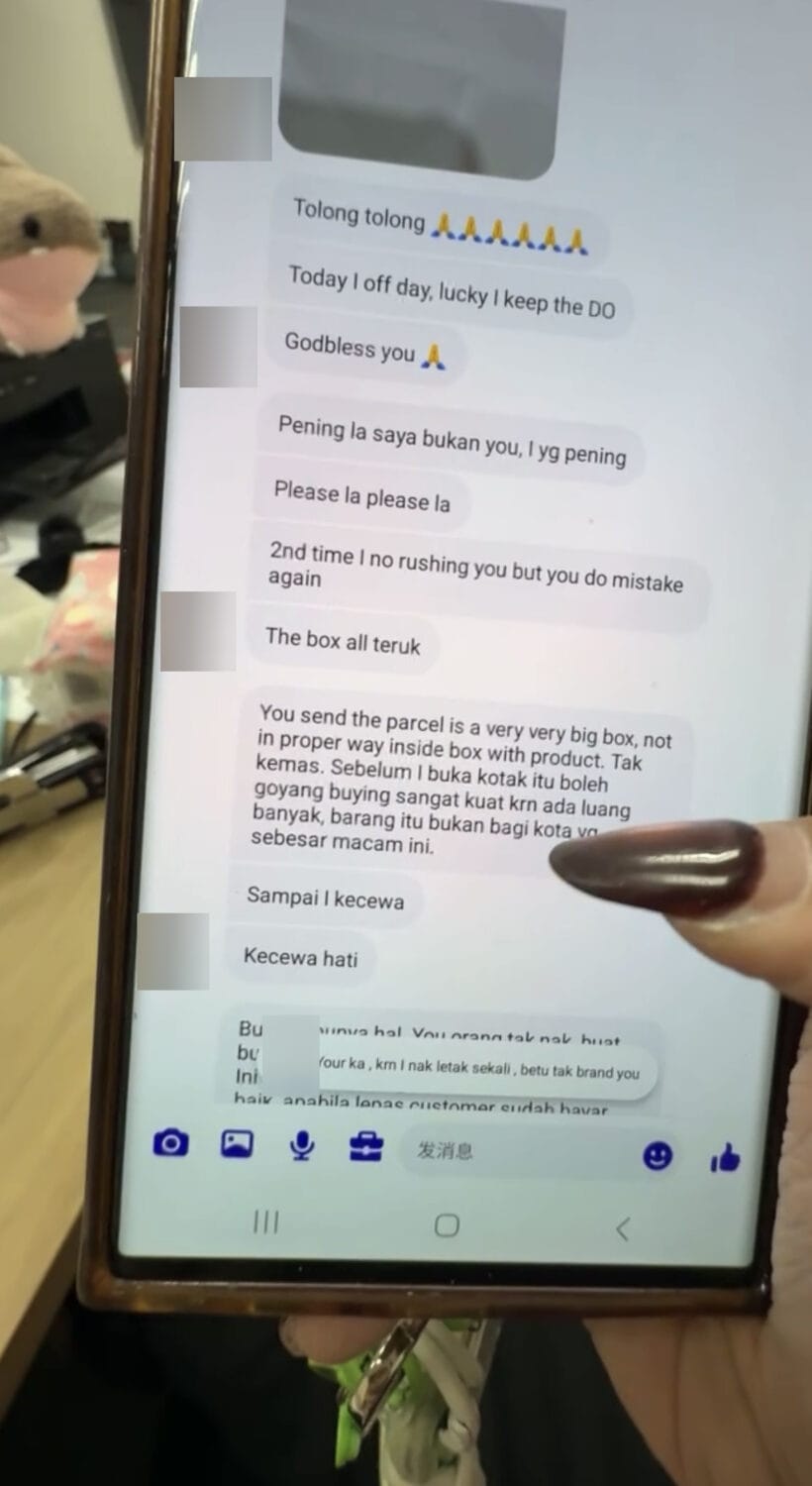 她表示一位顾客在 8 月 22 日的直播中下单了 58 样商品,之后在 9 月 9 日又下单了其他 4 样商品,她已经告知顾客会先发 9 月 9 日下单的包裹,可是顾客收到包裹后却质问他们为什么只来了 4 样东西,还不断信息去她公司的后台,甚至是用语音责怪她。