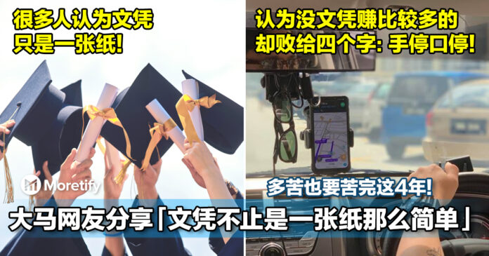 不过就有一名大马网友认为,除非没有选择,否则不管多苦,至少也要苦完这 4 年!他也转发分享了文凭和学历对人生后半段的影响,一起来看看他怎么说吧!