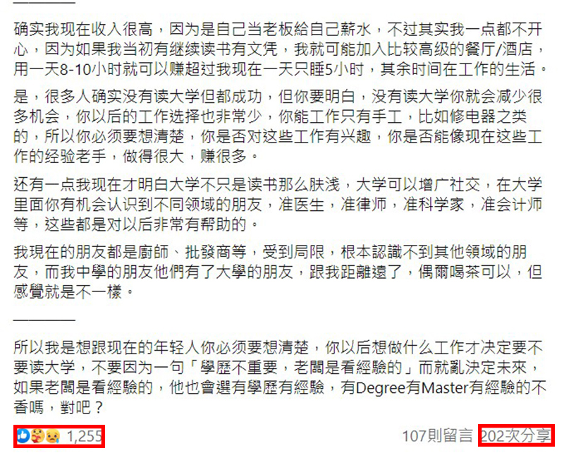 ▼楼主透露,自己现在收入虽然很高,不过其实自己一点也不开心,因为如果自己当初有继续读书、有文凭,就可能加入比较高级的餐厅、酒店,一天工作 8~10 小时就可以赚超过现在一天只睡 5 个小时、其他时间都在工作的生活!