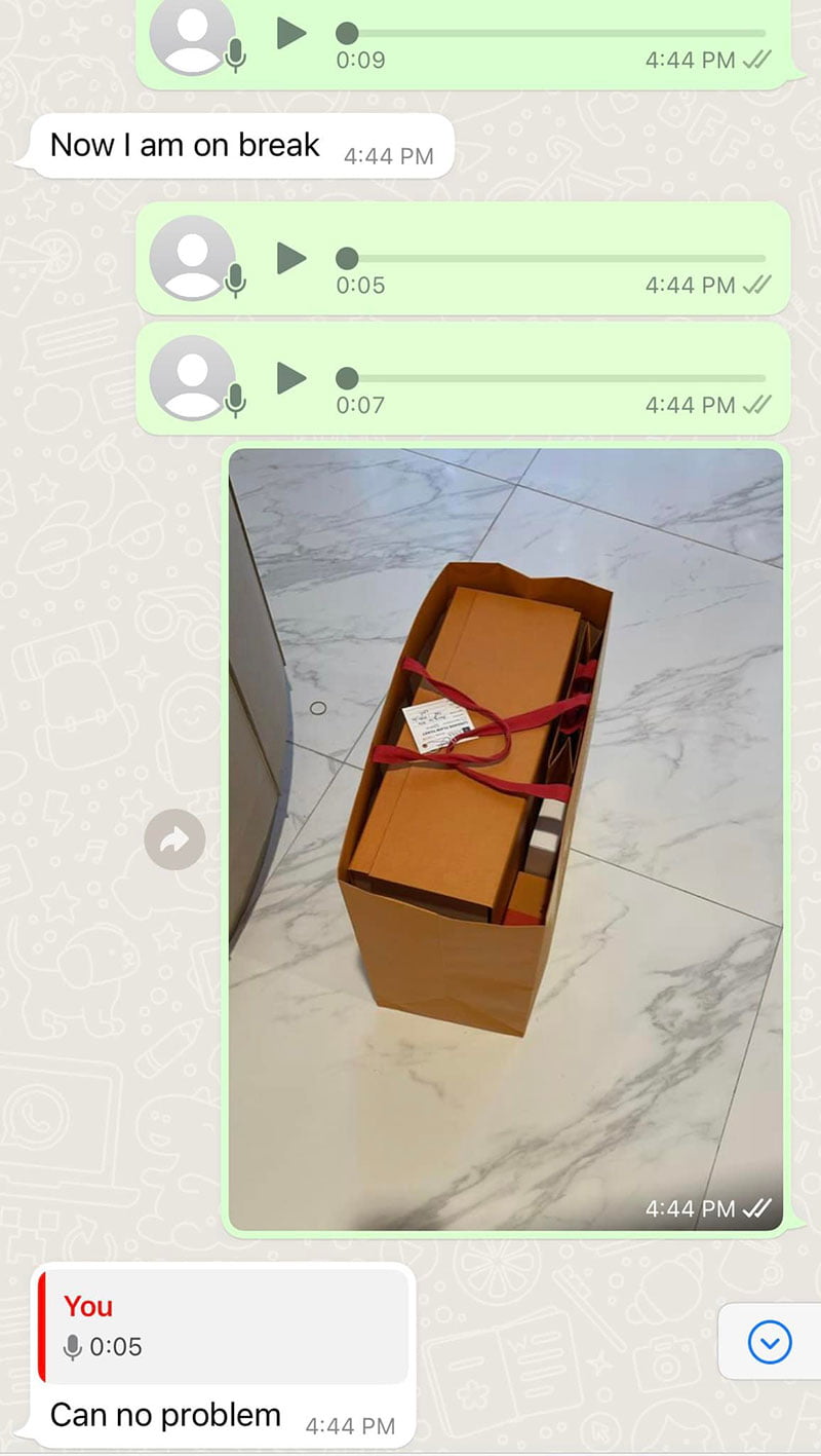 那位女经理可能看到了,也或许没看到,就告诉楼主会交代 SA 帮他邮寄。但是过后她打来告诉他说:「 DHL 把他的物品重新退了回来,因为袋子里有私人物品,还质问他为什么没有事先申明里面有东西?」