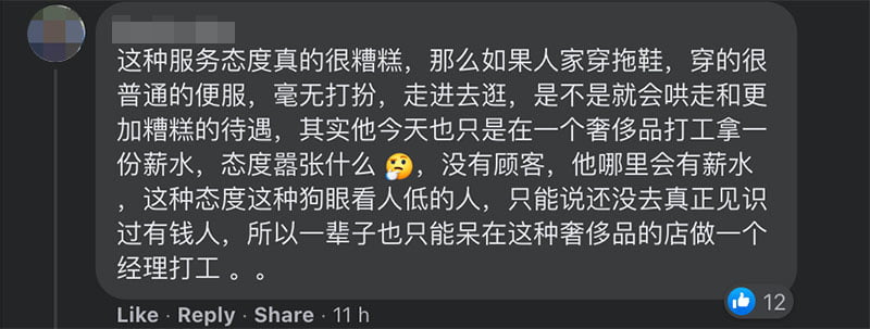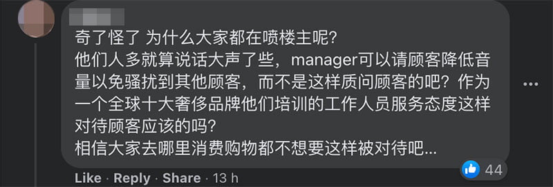 那时,Starhill LV 女经理就直接走过来并用比较不好听的语气对他们说:「怎么这些人站那边没买东西?」楼主他们当下就傻眼,如果没钱买东西难道就不可以走进去 LV 看商品吗?他和朋友就已经很不开心直接问她:「没买东西可以站在那边吗?」