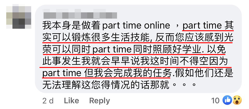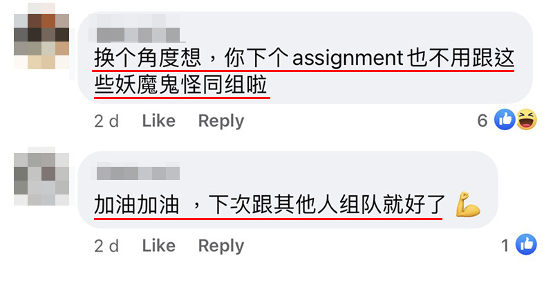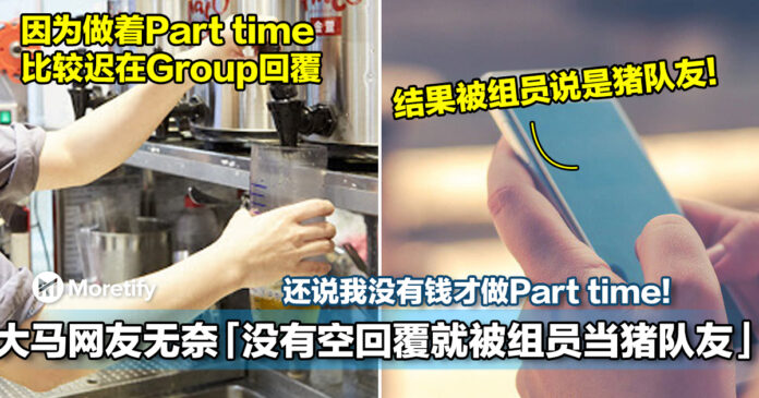 ▼一名大马网友就很无奈,自己因为要做 Part time,比较迟回覆 Group 的讯息,结果被组员说是猪队友!