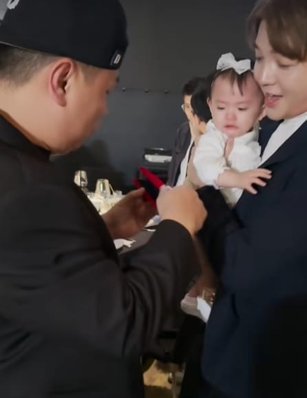 ▼到了宴会现场,他立马拿出金手链帮干女儿带上。