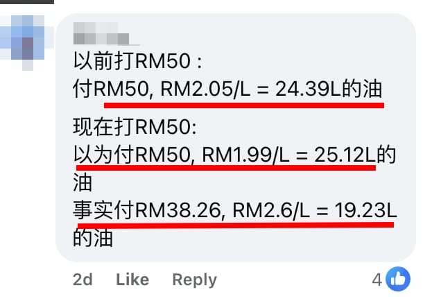 她还表示,之前油价还没得到补贴的时候,打 RM50 可以跑 2 个星期,甚至还有剩;而到了汽油补贴 1 公升 RM1.99 的时候,同样打了 RM50,却在 1 个星期 Kosong。