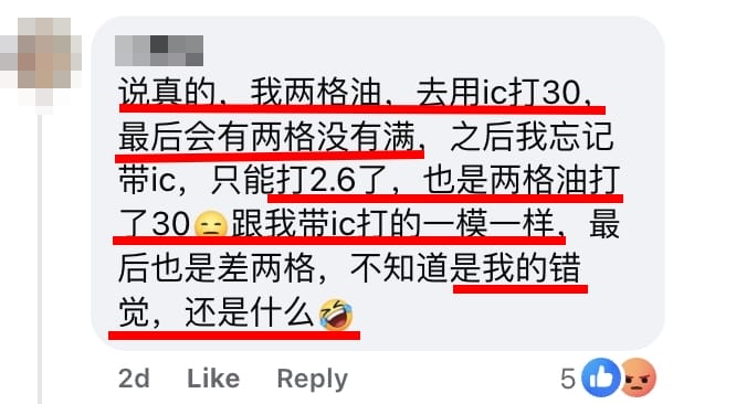 早前,一名网友发帖称,每次打油RM60就full tank。但自从用了 ic 后,一样用RM60块也补加了到RM78块,却没有 full tank 还少一格。