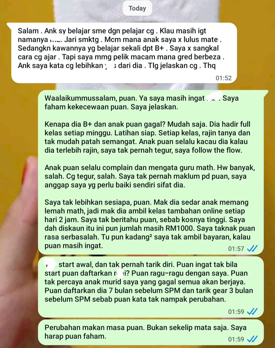此外,她还表示该学生仅上了四个月补习班,并在 SPM 考试前三个月就被母亲停课,原因是认为孩子补习了这么久,成绩还是没有进步。