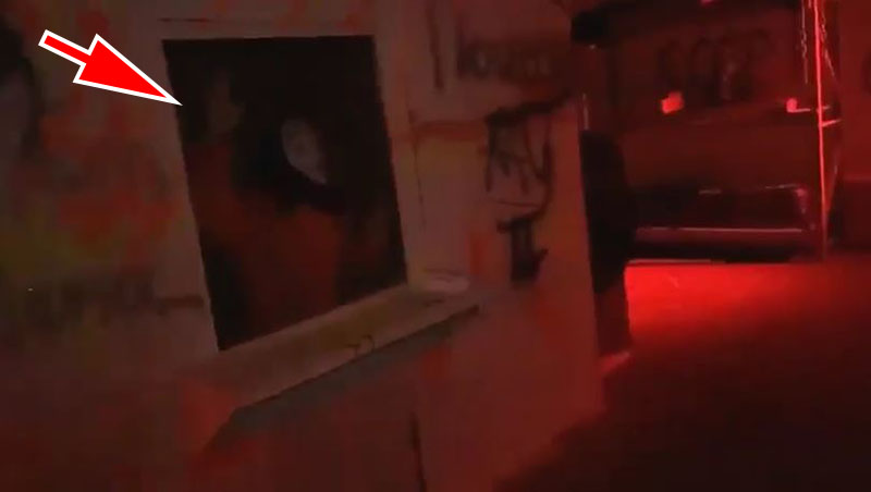 ▼惊魂未定的情况下,转头仔细一看,原来发出巨响的是在身旁窗户中的「鬼」!扮鬼员工不断拍打着窗户,吓唬四个年轻人!