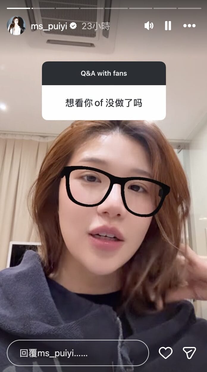 自从 MsPuiYi 宣布一件一件穿回去后,不少粉丝表示很失望,再也看不到她的新作品了,因此很多人希望她可以重出江湖,为此她在 Instagram 限时动态一次过回应男粉丝如果要她「再次出山」的条件。