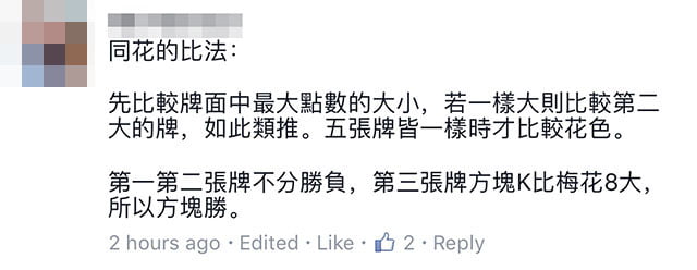 ▼根据香港扑克游戏网站所说,当同花出现比较的时候,比较方式是「以最大的数字做比较,如果数字相同,才以花色做比较。」