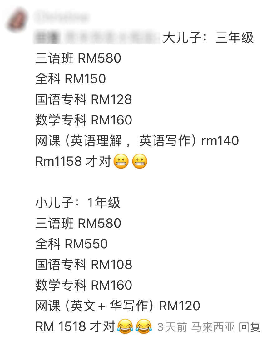 她称大儿子今年三年级,补习费用包含三语班 RM 580、全科 RM150、国语专科 RM 128、数学专科 RM 160、网课(英语理解和写作)RM 140。