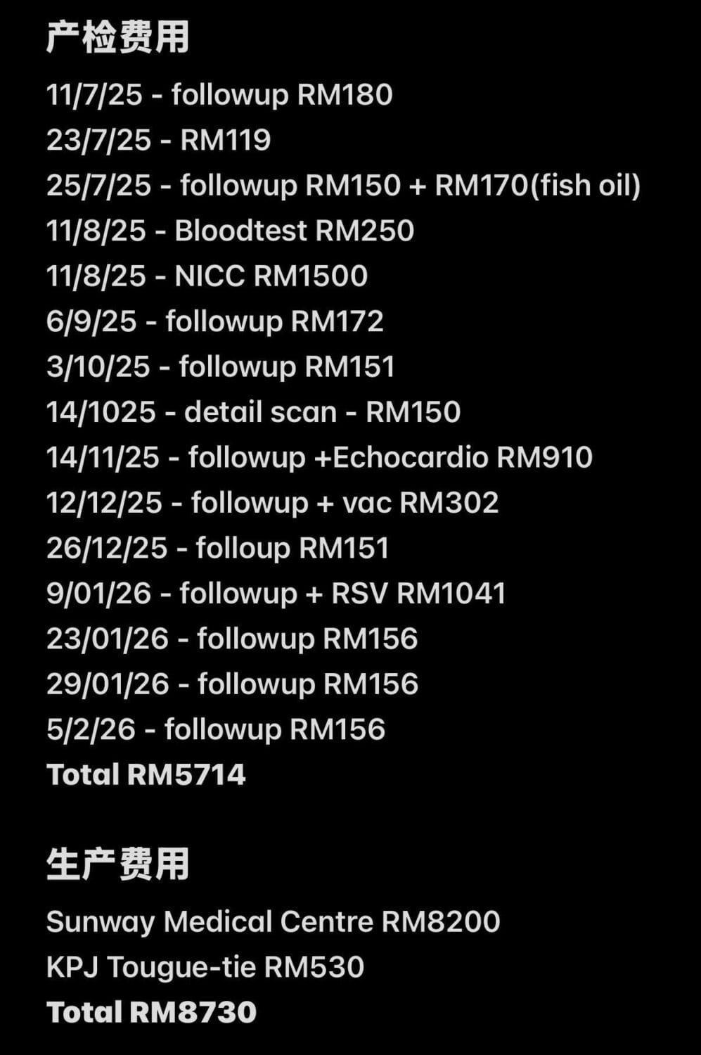 怀孕初期从 2025 年 7 月开始产检一直到 2026 年 2 月,一共 15 次的花费为 RM 5,714。而她选择在私人医院生产,花了 RM 8,730。