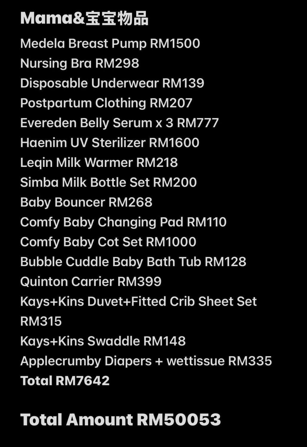 除了以上这些,她还要买一些日常的生活用品给自己和宝宝,像是产后用品、婴儿衣服、婴儿奶嘴、奶瓶等花了高达 RM 7,642。这些费用全部算下来至少超过 RM 50,000。太吓人了...