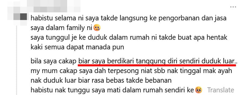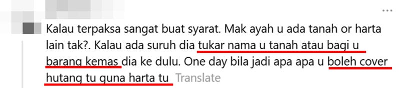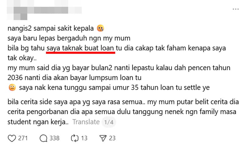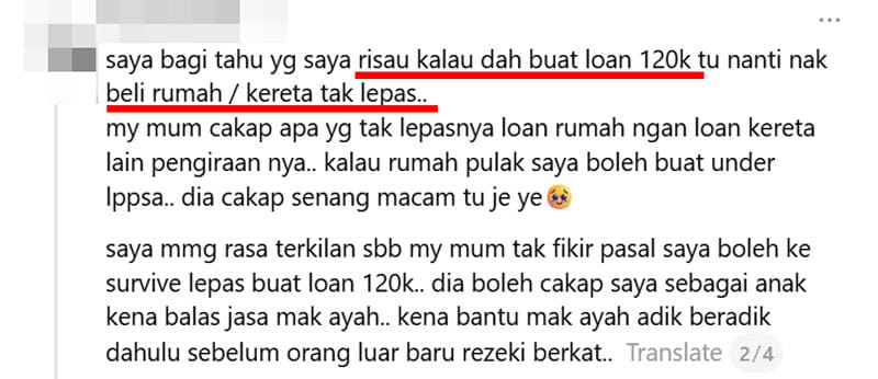 女子拒绝的原因是担心贷款会影响她日后买房和买车。最令她心寒的一点是,妈妈完全没有体谅她的处境,只是一味坚持贷款买地,在她拒绝后,反指控她不懂得感恩和孝顺长辈!妈妈称买车买房的贷款另当别论,还指她可以利用公务员房屋贷款(LPPSA)来买房。