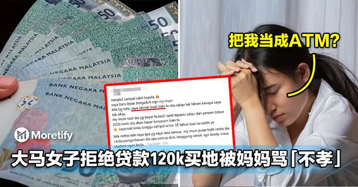 大马女子在 Threads 申诉,因拒绝贷款买地而与妈妈发生争执,还被其指责为「不孝女」,让她感到十分难过。她透露,妈妈要求她申请一笔 RM120k 的贷款来购买土地种田,但她认为不妥所以没有答应。没想到,妈妈并不想理解,反而坚持让她先按月支付供期,待她 2036 年退休后再以退休金付清。这也意味着她必须背负贷款直到 35 岁。