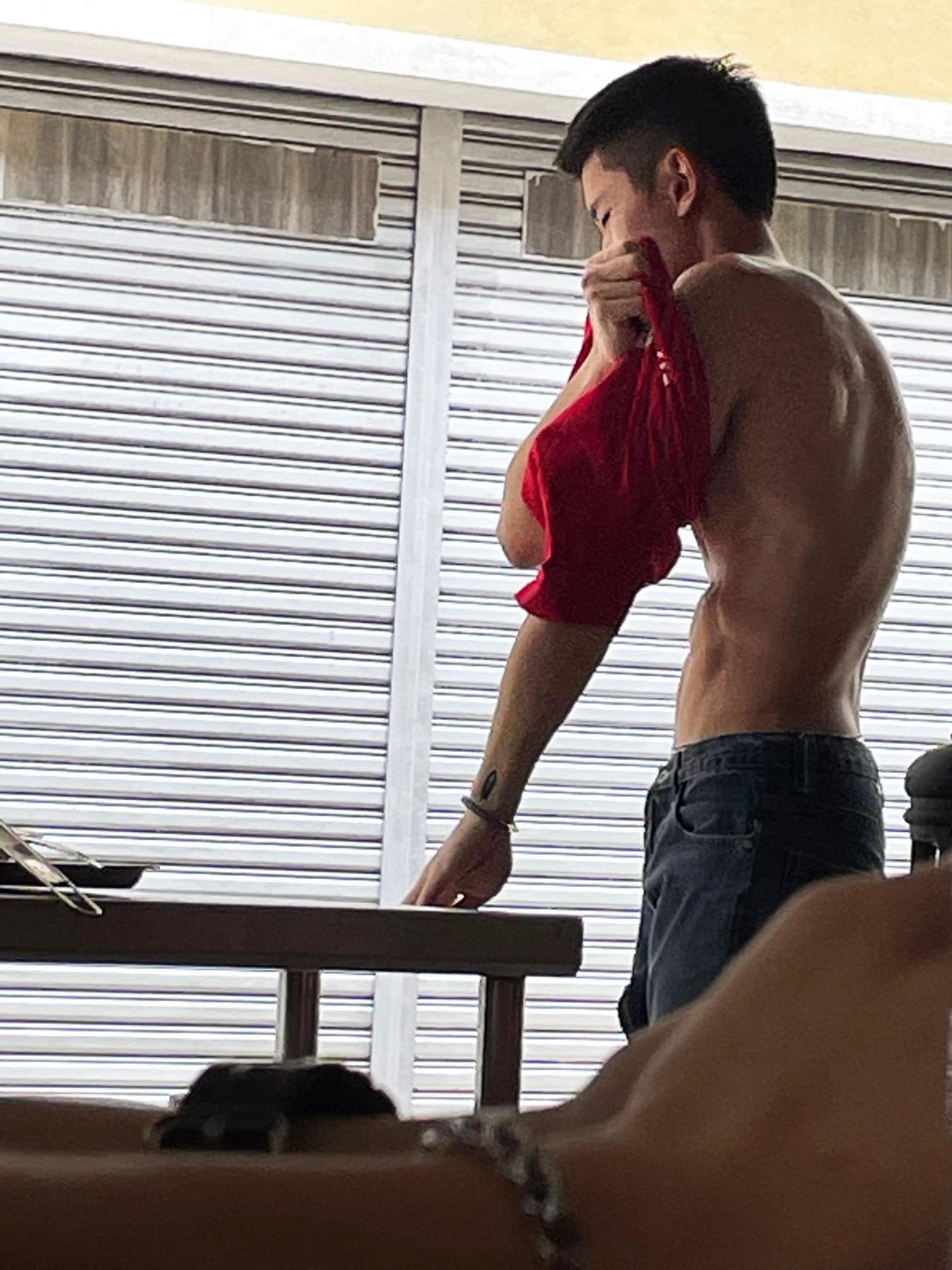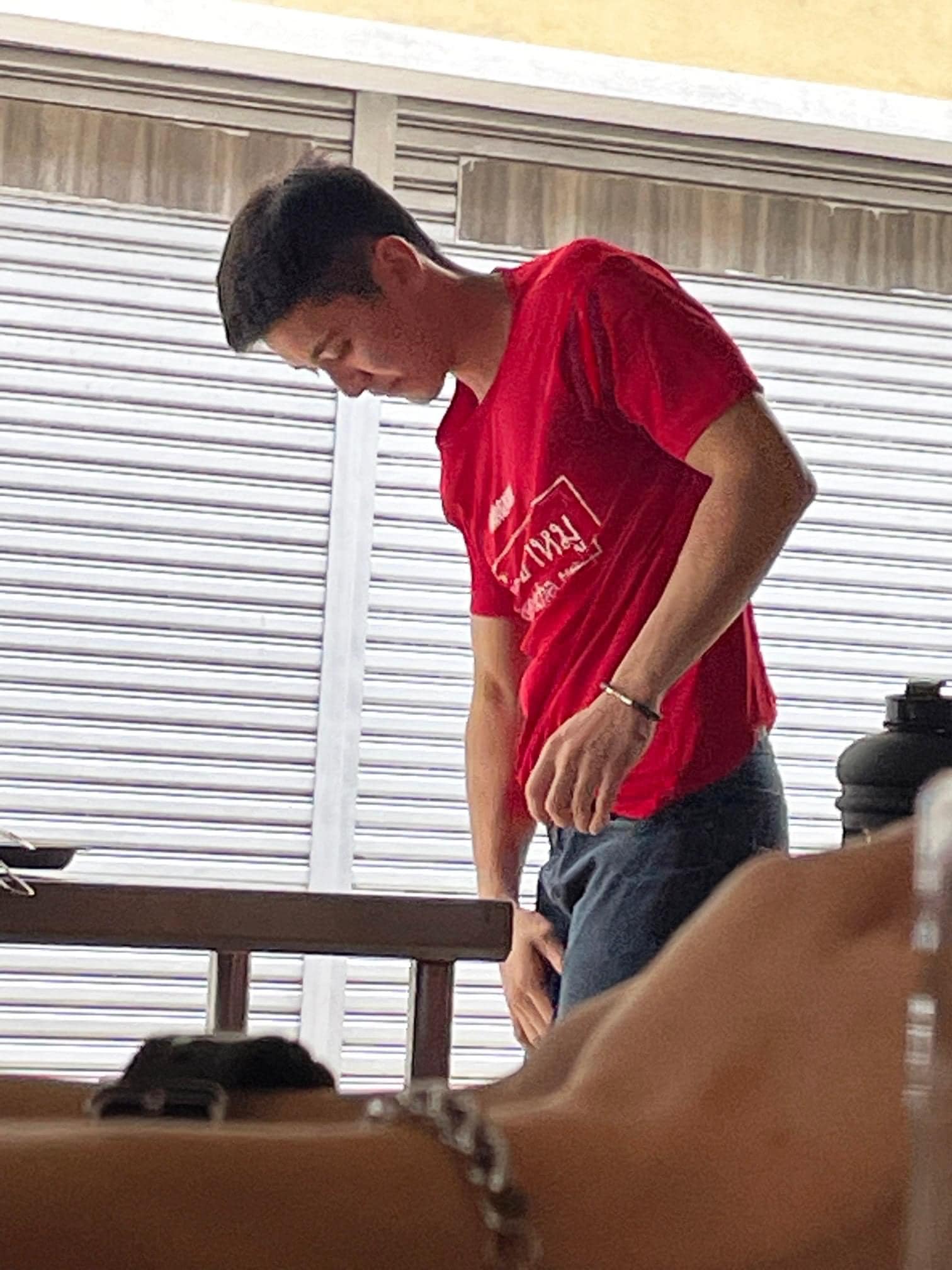 从照片可以看到,小哥哥仅身穿档口的红色制服,并佩戴黑色帽子和围裙,岂料下一秒拍摄的照片画风一转,小哥哥已经拿下了帽子,褪去了围裙,正把红色的摊贩制服换下。