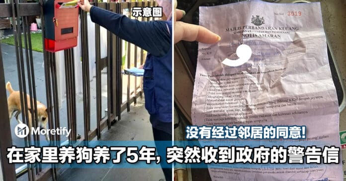 近日,一位网友收到了来自居銮市议会发出的警告信,内容称他没有经过邻居的同意就在住家养狗,因此当局要求他在 14 天内处理好。