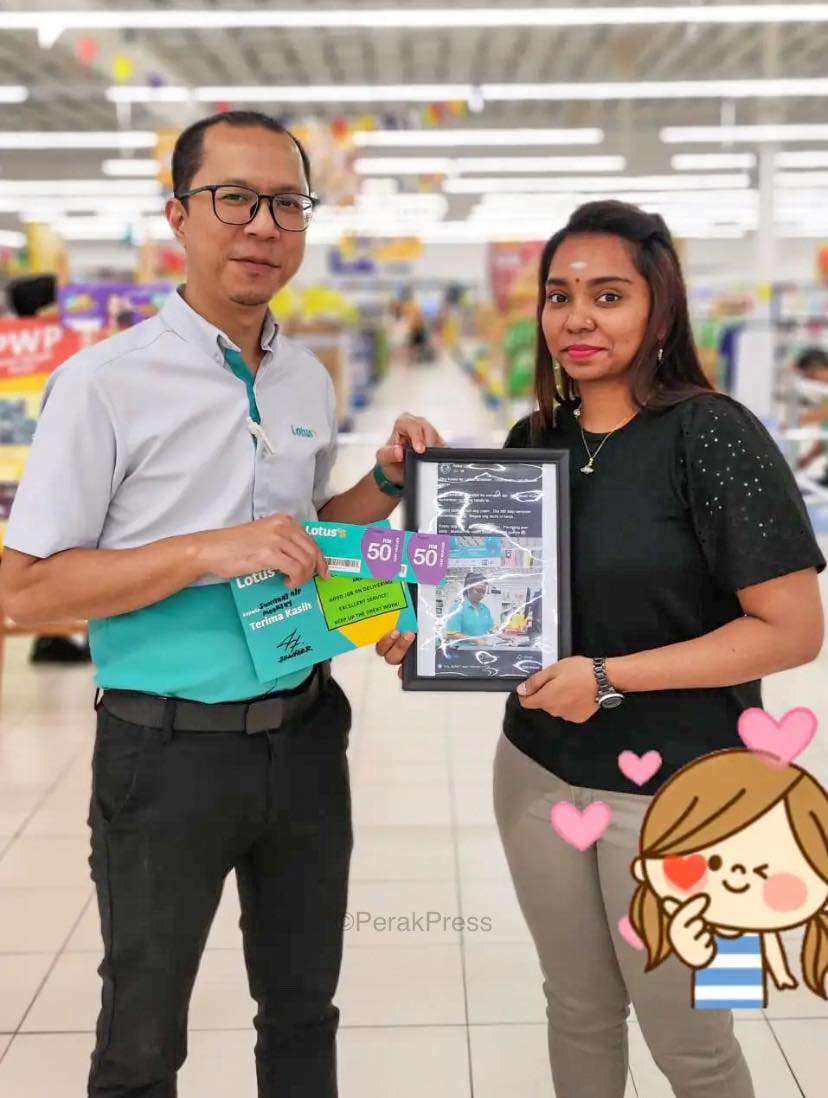 根据《Perak Press》报道,女收银员名为 Sunithaj Moorthy,Lotus’s Malaysia 对她在服务顾客方面展现了非常敬业的态度,也因此颁发了一份感谢证书和礼品券送给她!