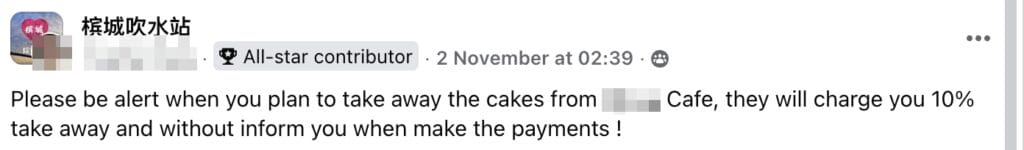 而该网友因为当时因时间有限,她的朋友于店内购买蛋糕后边匆匆离开,事后才发现被无预警的征收了10%「外带费」,来不及询问店家是怎么一回事。对此,该网友对店家这般做法感到非常无奈,并在帖子中呼吁其他人需对此保持警惕。