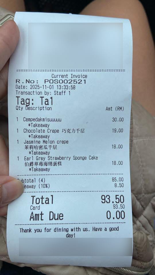 近期,有一名网友在 Facebook 发帖称她前几天前往位于槟城 Bayan Baru 的一家连锁咖啡厅,打包 4个不同口味的蛋糕,消费金额为 RM85。
