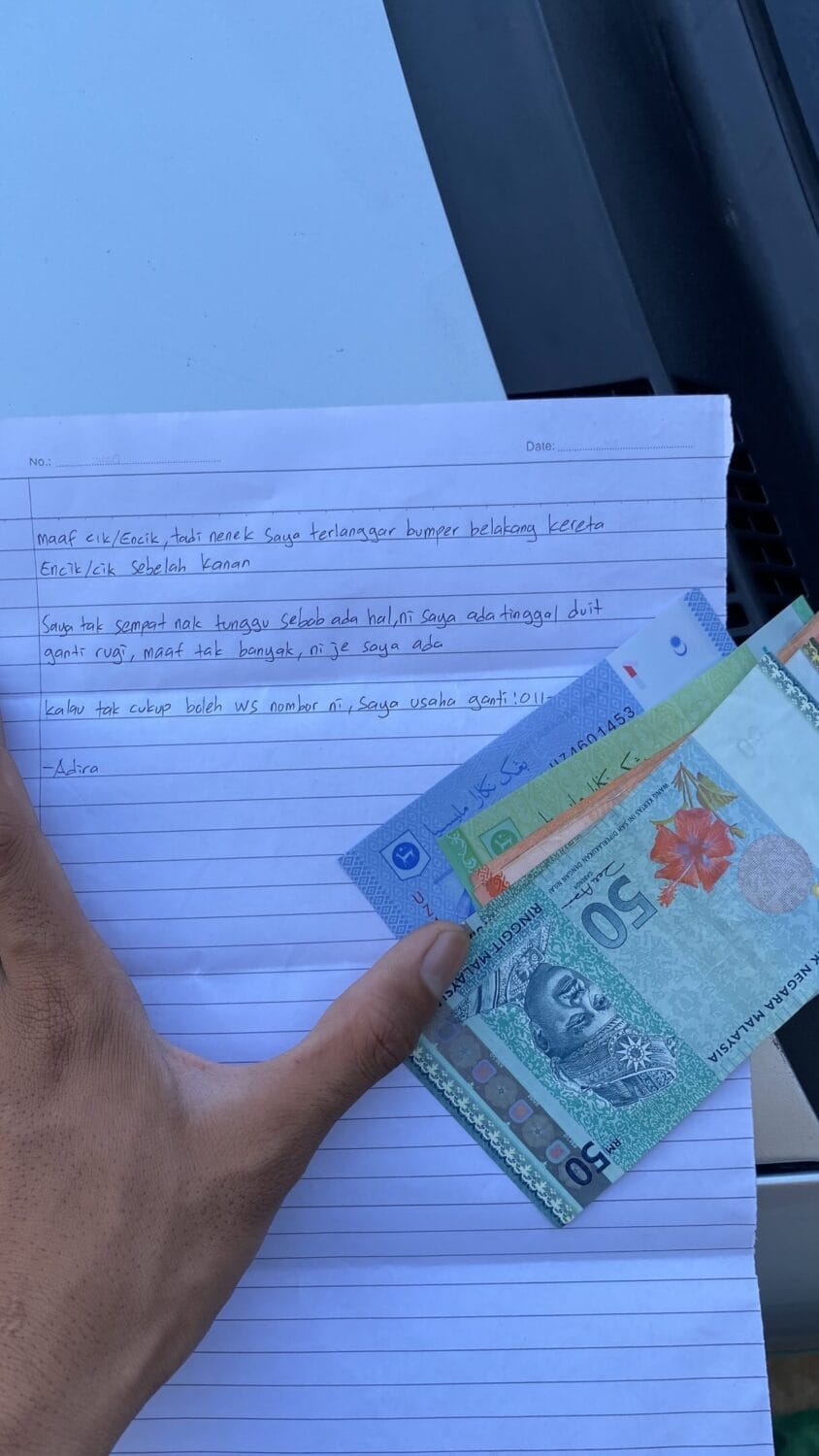 大马车主在 Threads 分享一名老妇和孙女不小心撞上他 Myvi 车尾后,留下道歉信并附上 RM206 赔偿金的故事。
