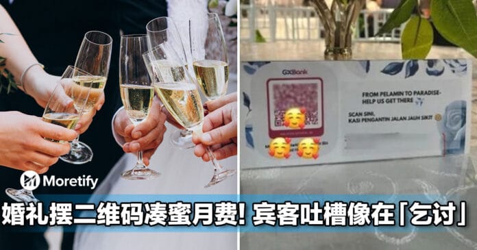根据 mStar 报导,一名婚礼宾客在社交媒体分享自己遇到的事情,引发网友热议!他说新人在宾客桌上放了一个小牌子,上面写着 Scan sini kasi pengantin jalan jauh sikit 意思就是扫描这里!让新人去远一点旅行,牌子旁边还附上二维码,给宾客直接扫码转钱「当成蜜月基金」!