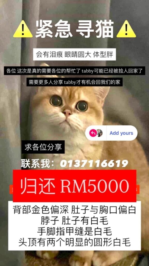在几天毫无线索的情况下,猫主才公开发出「归还酬谢 RM5000」的悬赏,希望引起对方注意。她强调,RM5000 的前提是涉及「金钱交换式归还」或疑似买卖行为,若只是路边找到并归还,酬谢标准为 RM1000,并已当场转账。