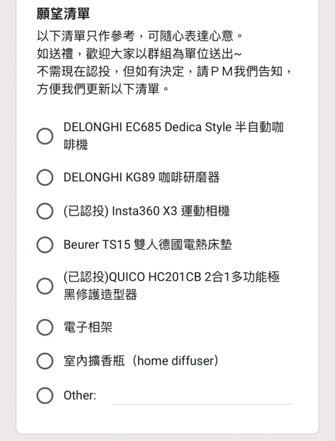 随后,同学还发来一份礼物「愿望清单」的 Google Form ,要求大家认领要送的婚礼礼物。令人傻眼的是,表格内还列明品牌与型号,包括半自动咖啡机、咖啡研磨双人电热床垫、多功能极黑修护造型器、电子相架等。若不想送指定物品,也可自行填写要送的礼物。