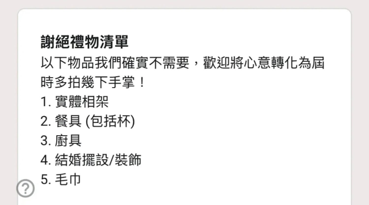 除了礼物「愿望清单」,对方还另外列出「谢绝礼物清单」,拒接出席者送实体相架、餐具、厨具、结婚摆设、装饰和毛巾。
