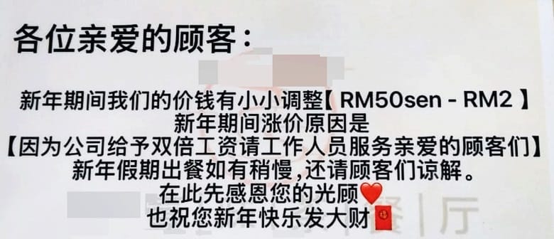 本地一家经营烧腊咖啡茶水生意的餐厅日前在新年期间起价,在店内张贴了「新春期间起价 RM0.50 至 RM2」的公告,却没有同步更新菜单上的标价,结果遭到顾客举报。