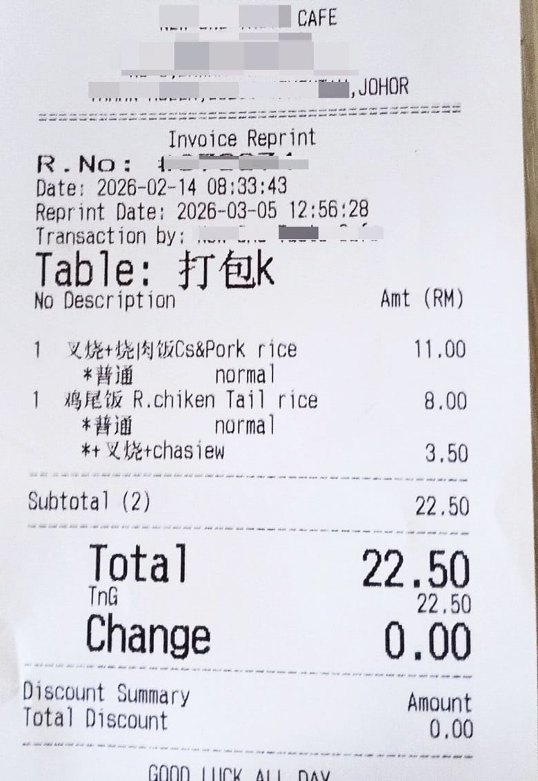 他从昔加末贸消部取回的收据副本中,了解到事情经过。根据收据显示,当天早上约 8:33 分,两名男女顾客带着一名幼童前来打包一份叉烧加烧肉饭(RM11,已起价 RM1.50)、一份鸡尾饭(RM8,已起价 RM1.50),以及一份仙叉烧(RM3.50,已起价 RM0.50),总额为 RM22.50。该名顾客是 2 月 14 日起价当天接待的首名顾客。