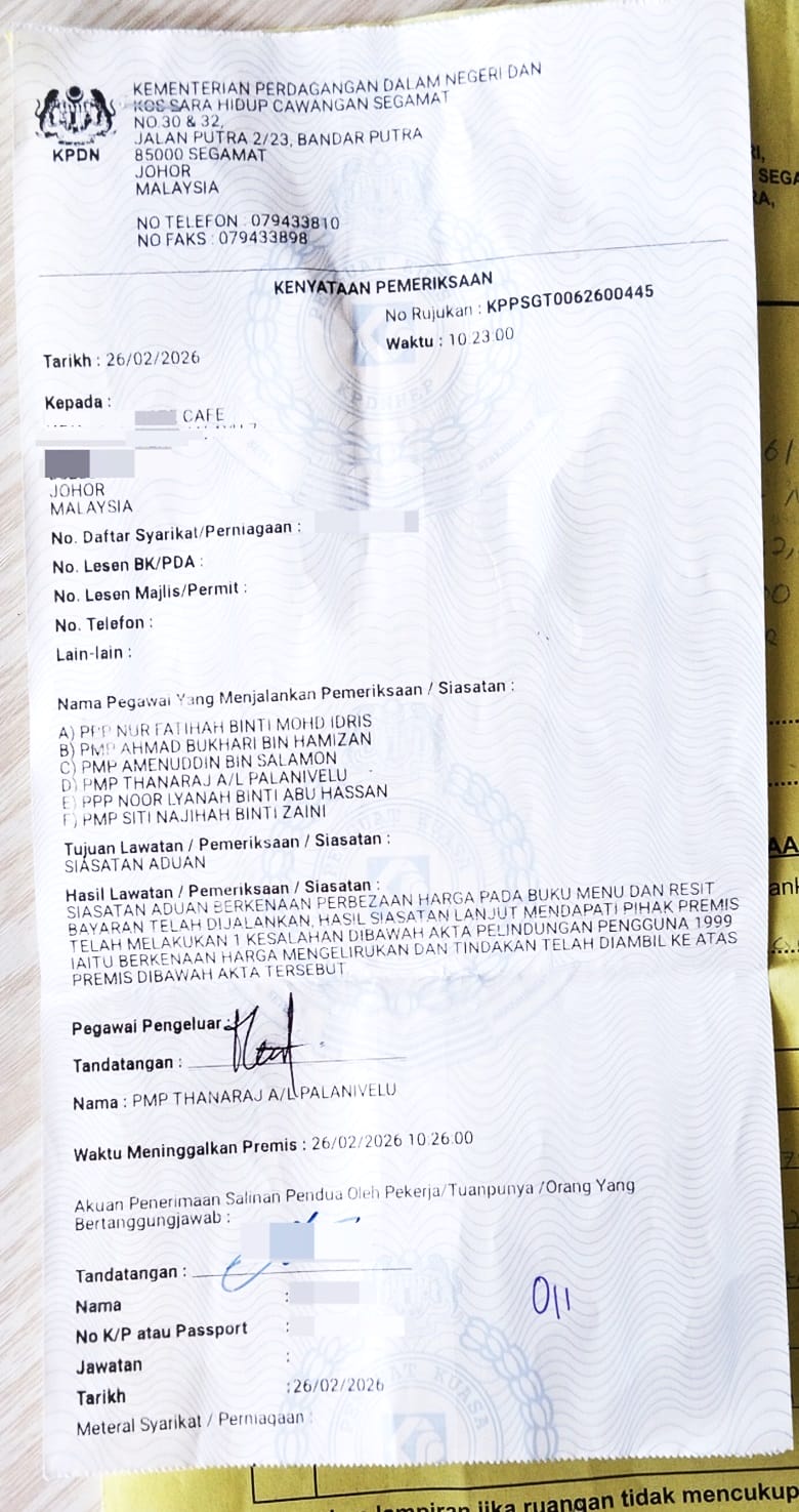 昔加末内贸局接获顾客对「菜单价目表与收据不符」的投诉后,对该餐厅展开调查。初步调查后,指业者向顾客展示误导性价格,而抵触了《1999 年消费者保护法令》。