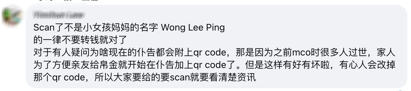 但讣告被广大网民在网上传来传去,有心人士竟然趁人之危把讣告上的 TNG QR 码换掉了!为此,妈妈再次上传讣告称小女儿的灵堂地点已更新,同时附上正确的 TNG QR 码,不希望网民的善心被有心人士利用。