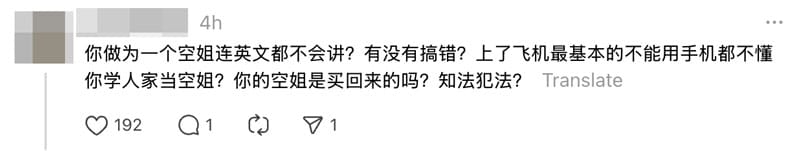 但她随后情绪激动地指出,在国际航班环境中,空服人员应具备中文沟通能力,并质强调「做国际航班的,连中文都不会讲,算什么服务」