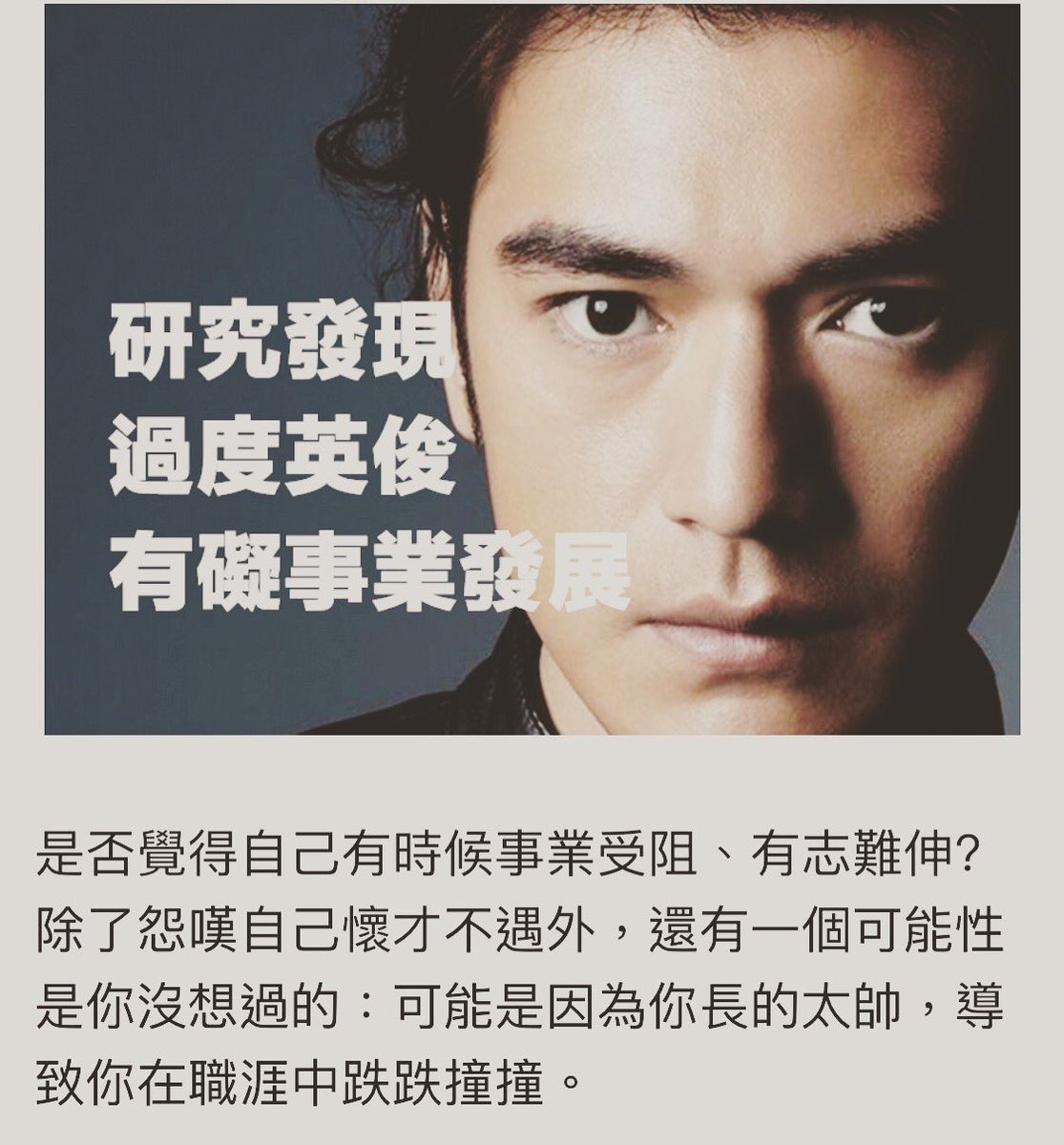 英国伦敦大学管理学院和美国马里兰大学共同完成的研究指出,长得好看的男性,容易被老板视为「威胁」,因此在工作职位上比较难得到赏识,也更难升职加薪。