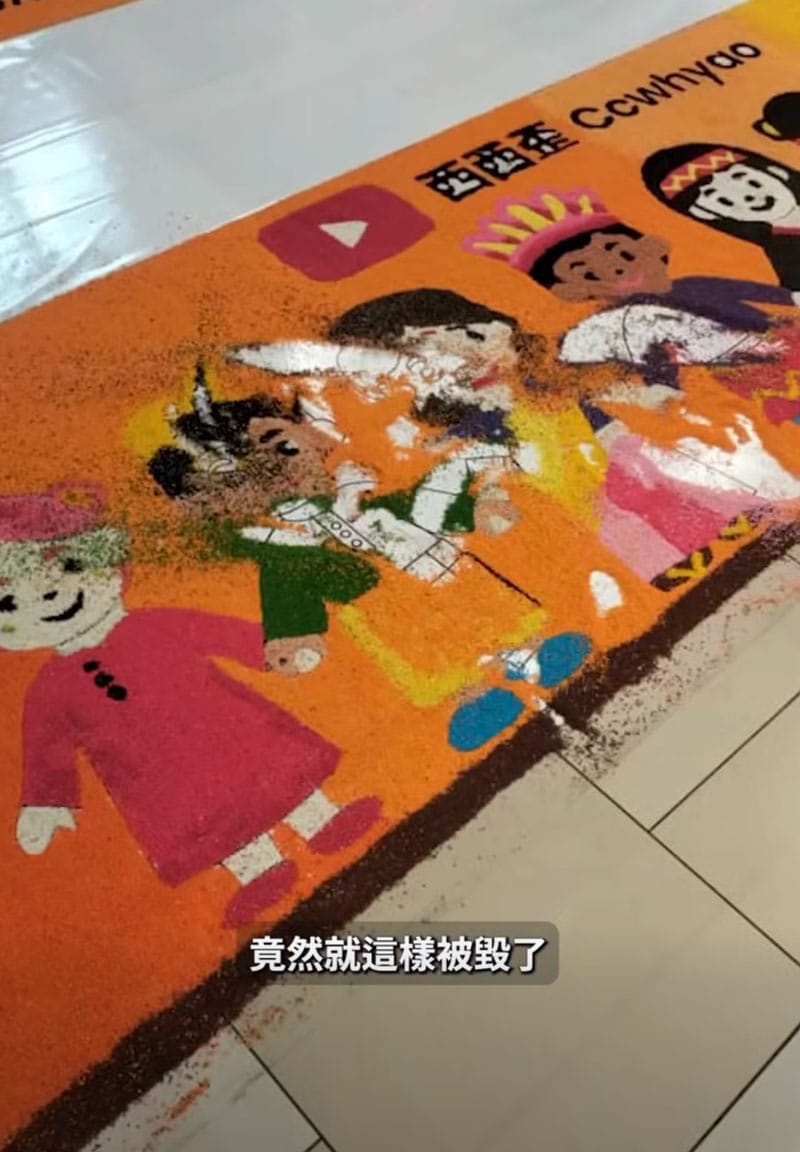不过,就在大家为破纪录欢呼时,一件让人揪心的事发生了!Kolam 竟然被小孩「抓花」了!西西歪在影片中无奈透露「当下真的很生气」!毕竟这是大家一起熬夜完成的心血。结果只要一个小孩,两秒钟,就能把整幅画毁掉...