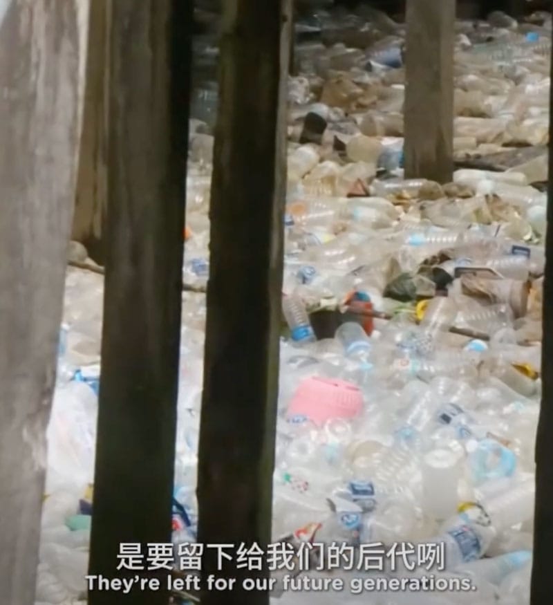 镜头一路扫过去,几乎找不到一处没有垃圾的地方。甚至可以看到小孩在堆满塑料瓶的海面上玩耍、向镜头开心挥手,水底的垃圾清晰可见。高脚屋底下、房屋间的缝隙、空地...全是纸箱、轮胎、宝丽龙饭盒、塑料袋、塑料瓶,让人看了又心疼又无奈。