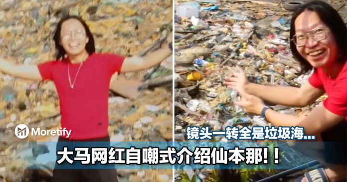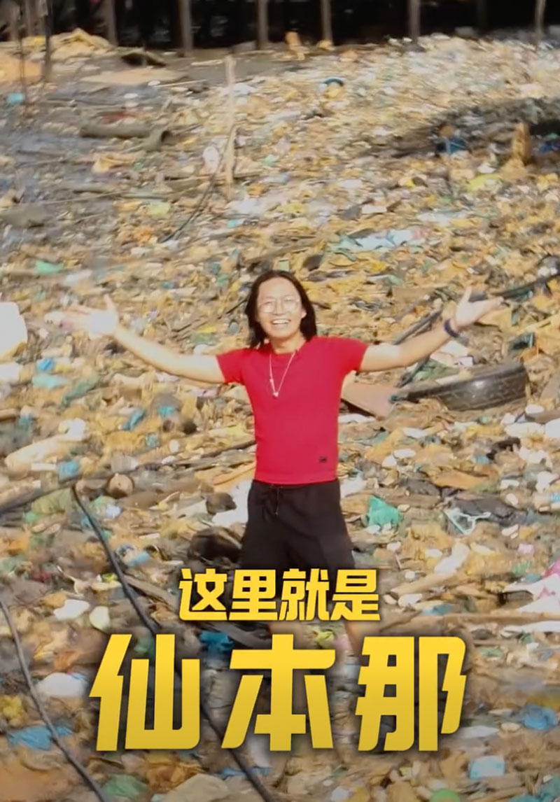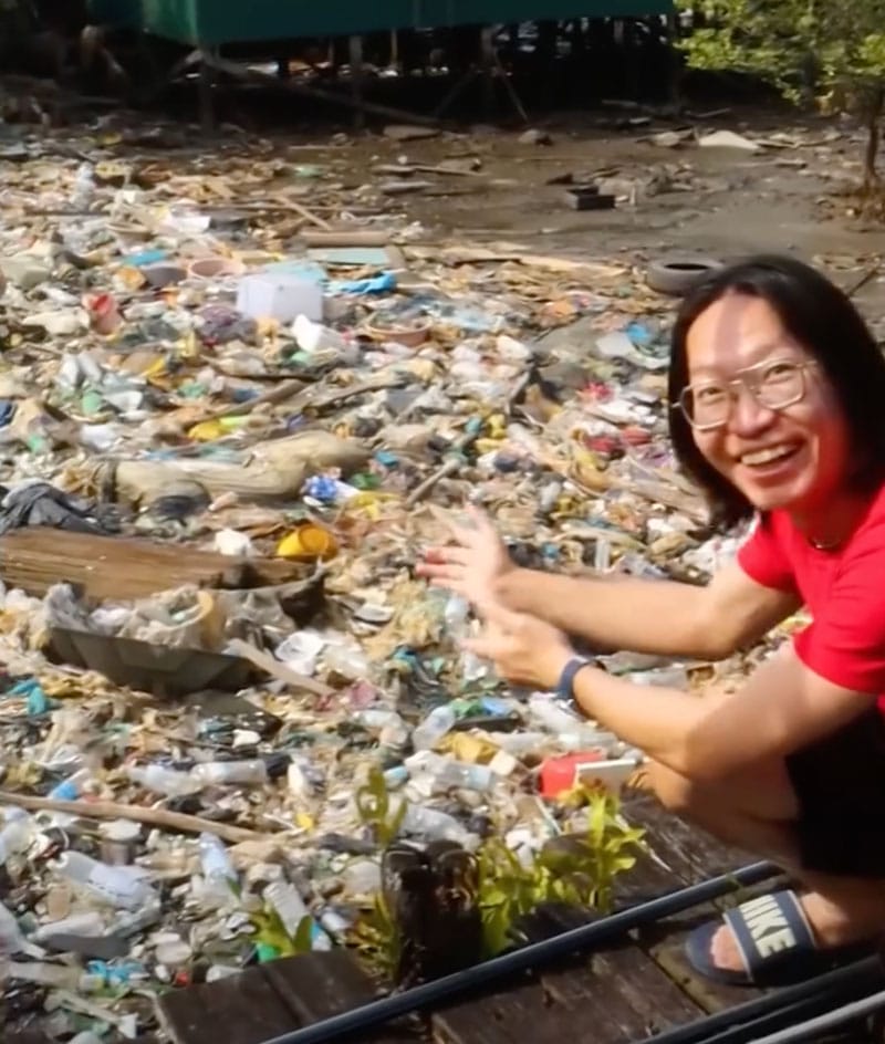 影片里,他站在垃圾堆中,一边笑着一边说「来到沙巴一定要来这边,这里就是仙本那」但身后那一堆堆废弃物,配上他热情欢迎的语气,讽刺感直接拉到 100%。