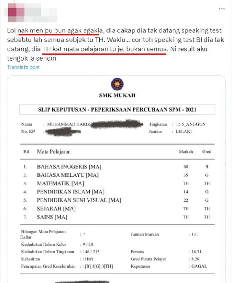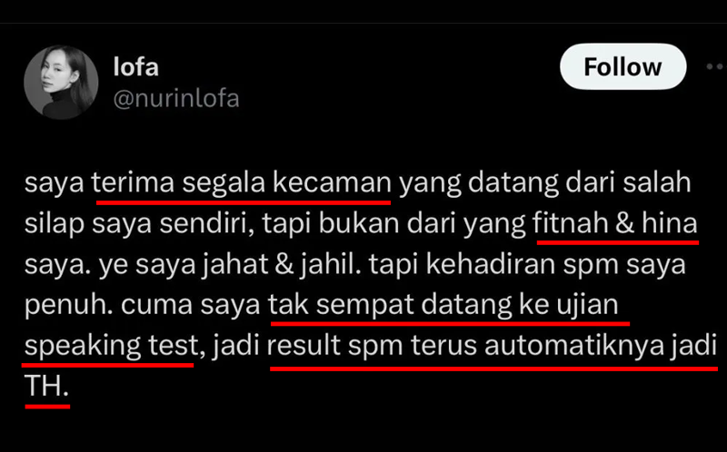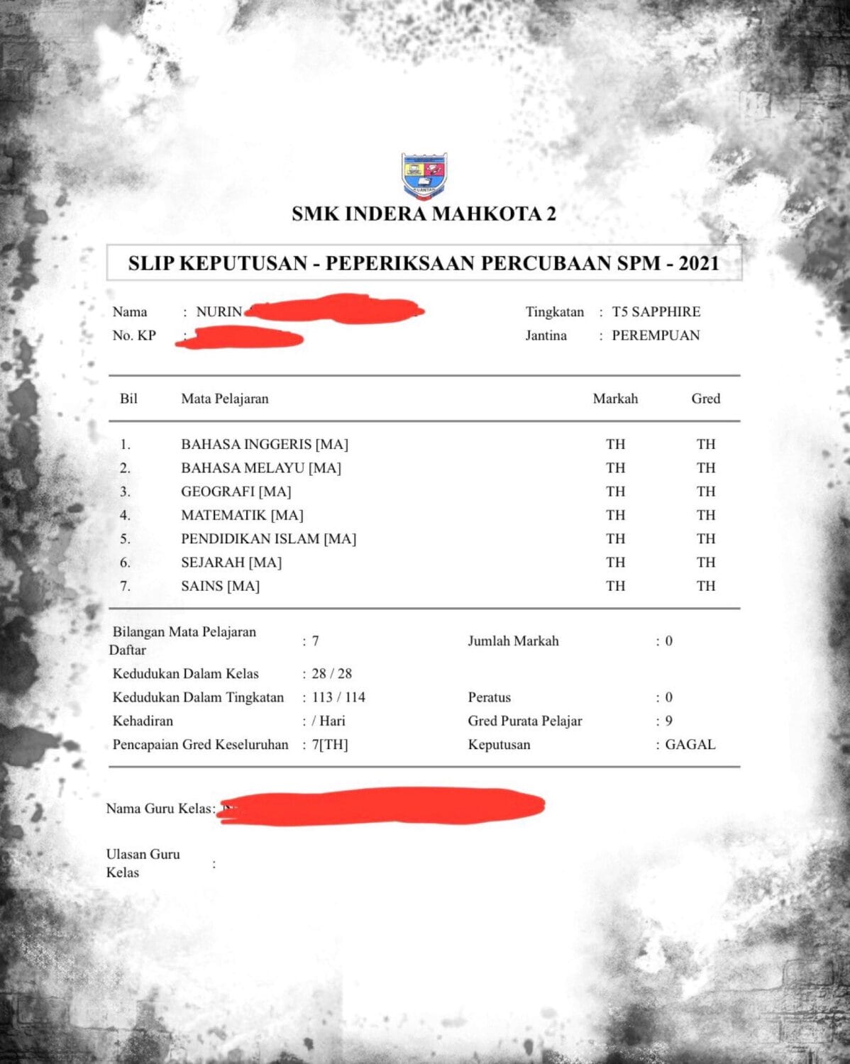 Nurin 过后也火速澄清,这份成绩单确实是自己的,但自己并没有无故缺席,表示自己有参加预考,但却因某种原因,没有去考英语口试,所以才会影响到其他科目自动变成了「TH」。