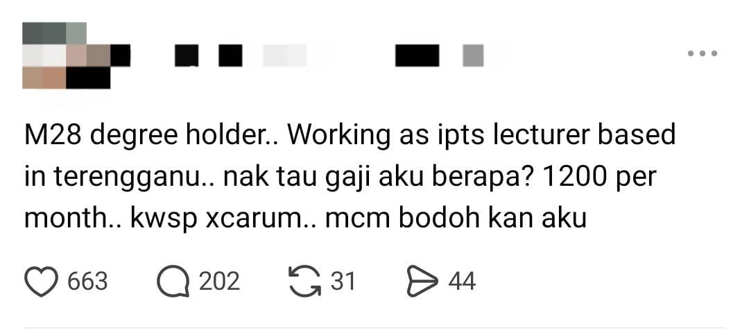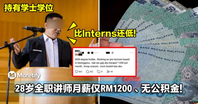 他透露,自己持有学士学位,毕业后在一所私立高等教育机构担任,但月薪却只有 RM1200,而且还没有公积金,这样的待遇让他倍感无奈!