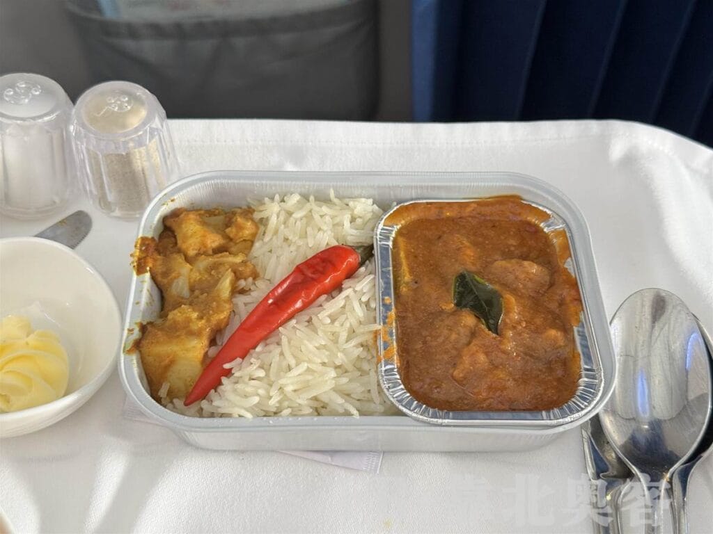 除了最初的咖喱鸡饭,他先后被端上了 娘惹亚参辣鱼、叁峇虾椰浆饭、鸡肉云吞面、印度套餐以及荷兰酱焗蛋,几乎把原本应在去程航班(吉隆坡飞清迈)的所有餐点一次补齐。