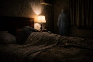 他瞬间心跳加速,全身发冷,连动都动不了,甚至想叫人帮忙却发不出声音。这时,整间房里弥漫着一股腐烂的气味,混杂着类似烧香的味道,让他感到极度压迫和恐惧。